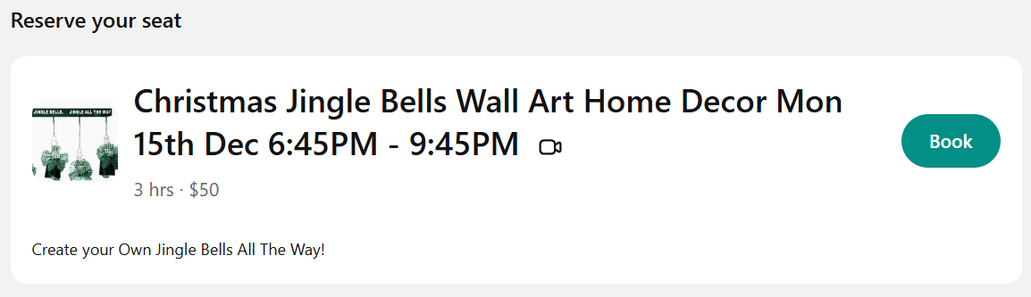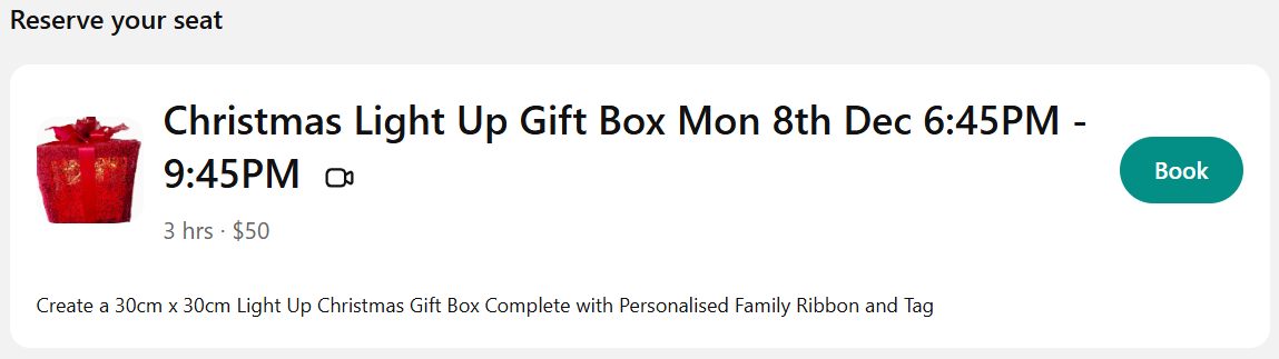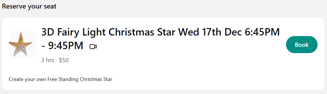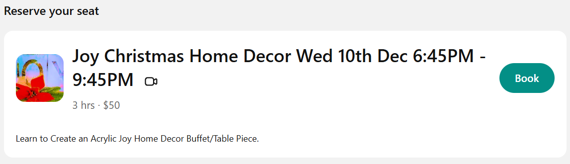 SUPPLIES YOU'LL NEED TO PARTICIPATE will be emailed once booked for each individual class or the complete Christmas Course